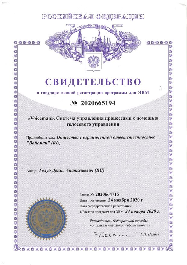 Компания- резидент технопарка высоких технологий Свердловской области, а также резидент Фонда Сколково, Voiceman взяла курс на подведение фундамента под свой инновационный бизнес: 24 ноября 2020 года компанией Voiceman получено Свидетельство о государственной регистрации программы для ЭВМ Voiceman ? системы управления процессами с помощью голосового управления.