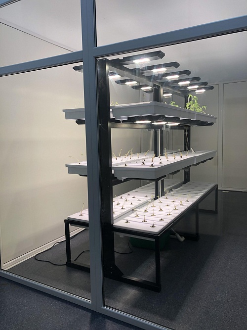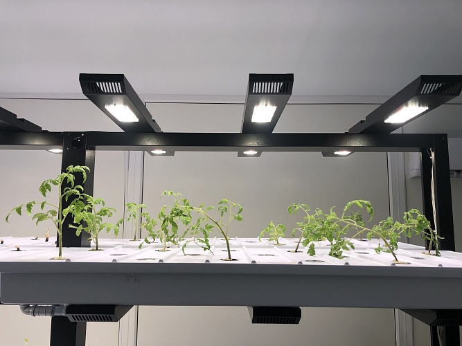 Обеспечение оптимальных условий для выращивания культур в условиях ограниченности естественного солнечного света в закрытых помещениях требует применения источников искусственного освещения. В AgroTechFarm используется специально разработанный светодиодный светильник, который имитирует солнечный свет и позволяет изменять интенсивность света и соотношение спектрального состава в зависимости от культуры, ее морфологии и стадии роста.